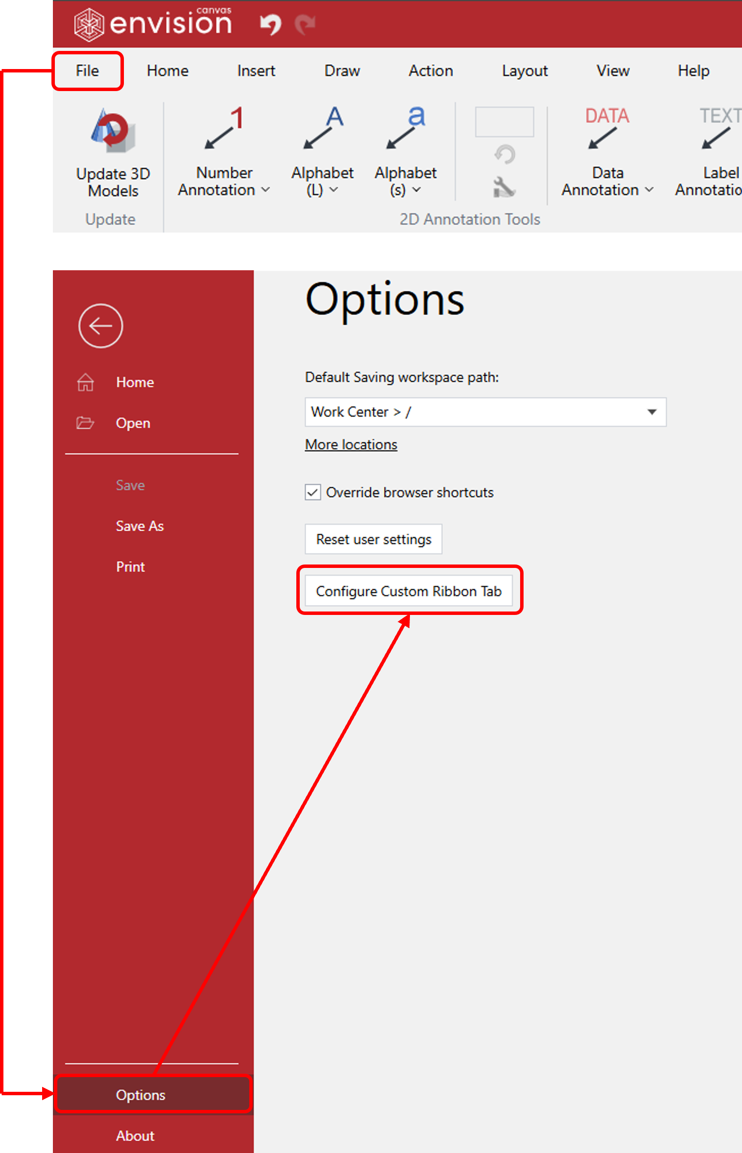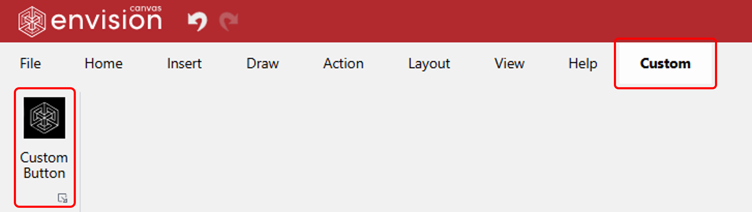 A custom ribbon button is a command element you can add to a special tab in the Canvas Envision interface. When clicked, it runs a JavaScript file you provide—allowing for anything from inserting shapes and text, controlling 3D views, to integrating external data via APIs.
