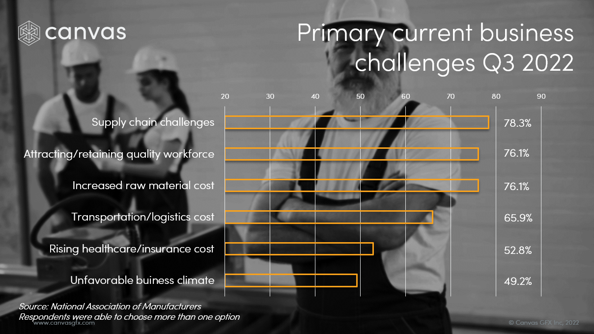 Let’s take a step back: Data from the latest Manufacturers’ Outlook Survey, published by the National Association of Manufacturers, shows that the primary business challenges facing the sector are issues with the supply chain, the cost of raw materials, and the attraction and retention of a quality workforce.