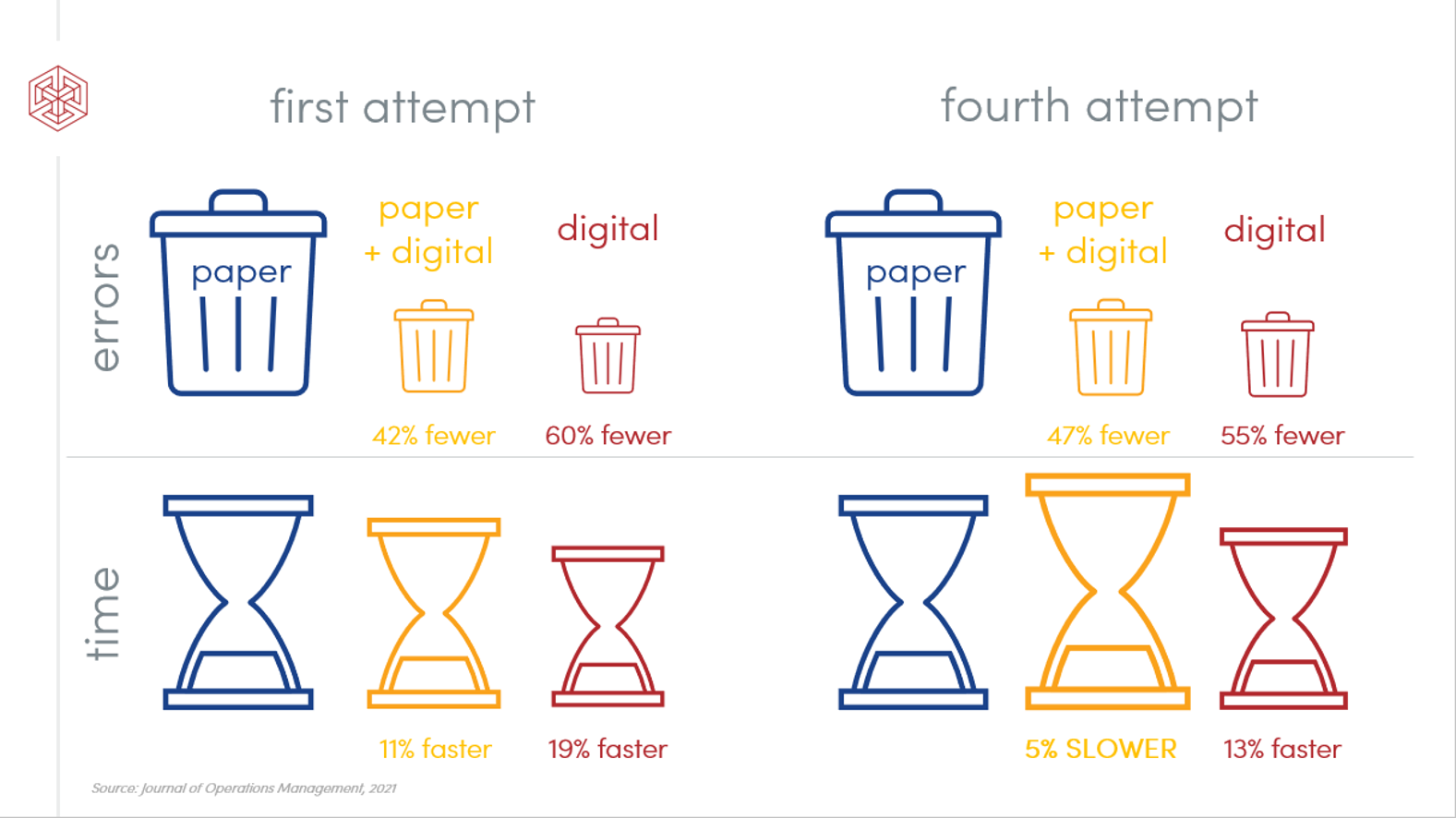 Moreover, the group with both paper and digital instructions performed worse than the digital-only group, even becoming slower as the experiment progressed.